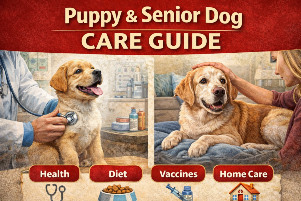 Complete puppy & senior dog care guide covering diet, vaccines, common illnesses, and senior dog mobility and home care tips.